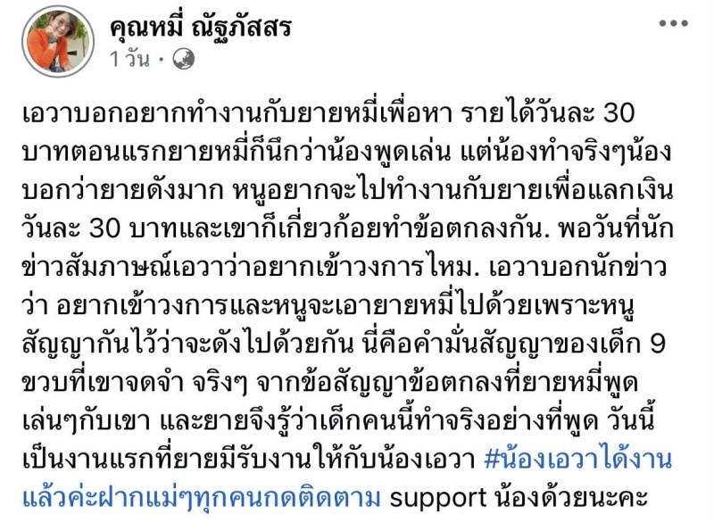 ซึ่ง ยายหมี่ เผยว่า น้องเอวา เคยขอทำงานด้วย เพื่อหารายได้วันละ 30 บาท แม้ค่าตอบแทนที่พูดถึงจะเป็นเพียงเล็กน้อย แต่กลับแสดงให้เห็นถึงความมุ่งมั่นของเด็กตัวน้อยอย่างชัดเจน