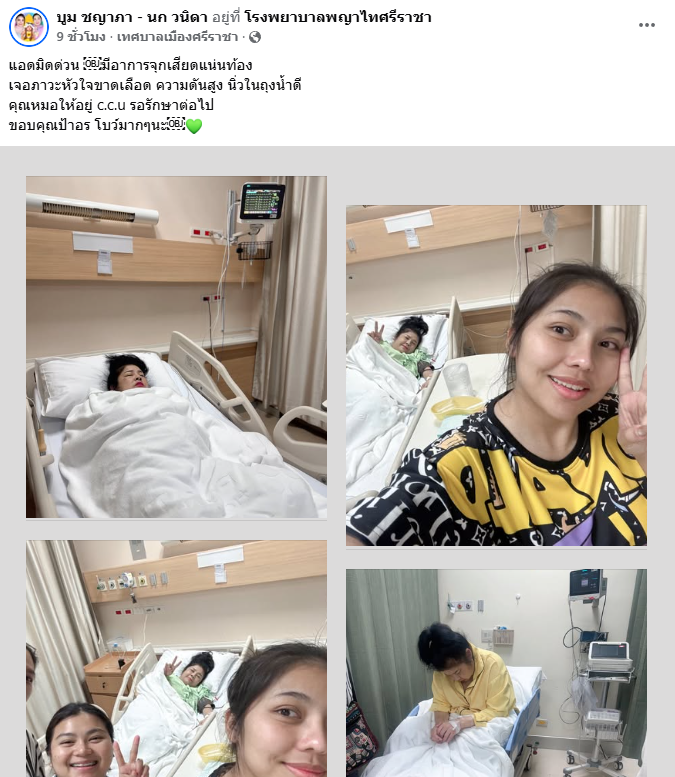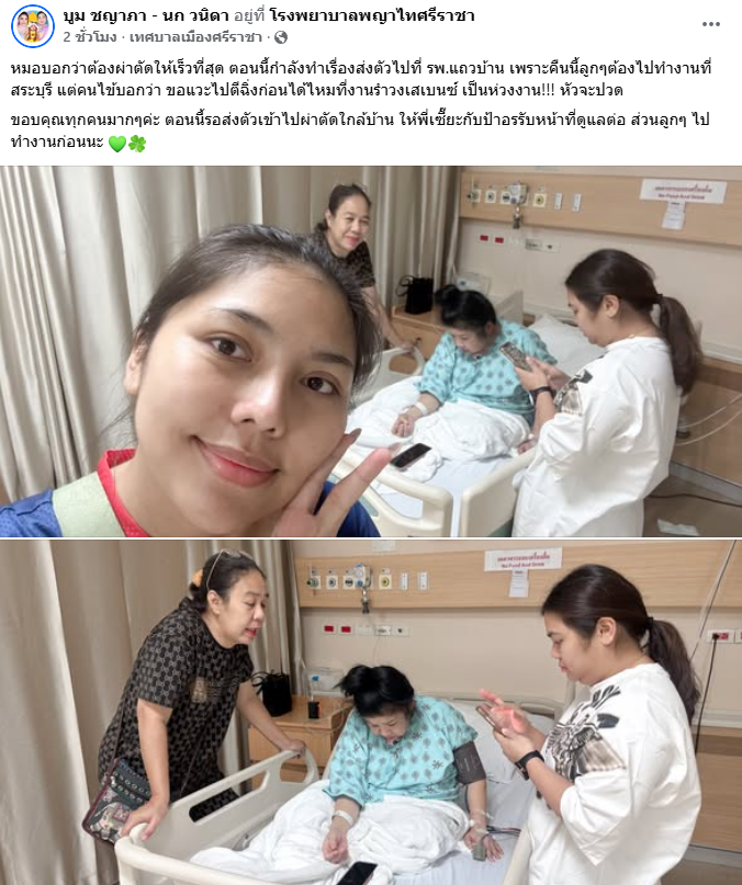 และต่อมา ได้โพสต์อีกครั้งว่า หมอบอกว่าต้องผ่าตัดให้เร็วที่สุด ตอนนี้กำลังทำเรื่องส่งตัวไปที่ รพ.แถวบ้าน เพราะคืนนี้ลูกๆต้องไปทำงานที่สระบุรี แต่คนไข้บอกว่า ขอแวะไปตีฉิ่งก่อนได้ไหมที่งานรำวงเสเบนซ์ เป็นห่วงงาน!!! หัวจะปวด ขอบคุณทุกคนมากๆค่ะ ตอนนี้รอส่งตัวเข้าไปผ่าตัดใกล้บ้าน ให้พี่เซี๊ยะกับป้าอรรับหน้าที่ดูแลต่อ ส่วนลูกๆ ไปทำงานก่อนนะ