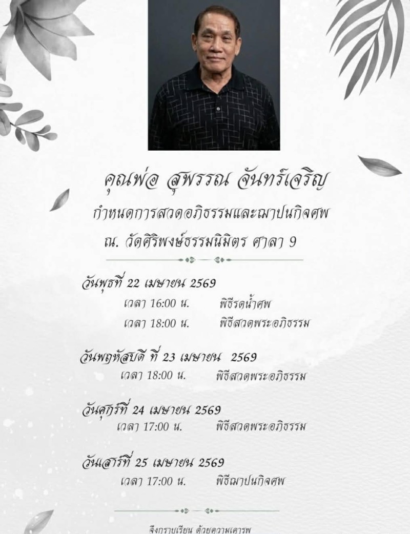 ก่อนหน้านี้ ทางครอบครัวได้จัดพิธีสวดพระอภิธรรม และฌาปนกิจเป็นที่เรียบร้อย ท่ามกลางบรรยากาศโศกเศร้า และความอาลัยจากคนใกล้ชิด