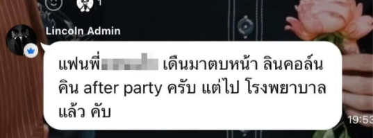 โดยได้มี ข้อความเผยว่า “แฟนพี่... เดินมาตบหน้า ลินคอล์น คืน after party ครับ แต่ไป โรงพยาบาลแล้วคับ”