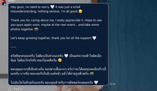 จากนั้น ลินคอล์น ที่ส่งเข้ามาในกลุ่มโอเพนแชต เพื่อชี้แจงบอกว่า เป็นความเข้าใจผิด “สวัสดีทุกคนนะครับ ไม่ต้องเป็นห่วงนะครับ เป็นแค่ความเข้าใจผิดเล็กน้อย ไม่มีอะไรจริงจัง คอปโอเคดีครับ ขอบคุณมากๆ ที่เป็นห่วงกัน คอปซาบซึ้งมากๆ หวังว่าจะได้เจอทุกคนอีกเร็วๆ นี้นะครับ บางทีอาจจะเจอกันในอีเว้นต์หน้า แล้วได้ถ่ายรูปด้วยกัน ไปเติบโตไปด้วยกันนะครับ ขอบคุณสำหรับการซัพพอร์ตเสมอครับ”.