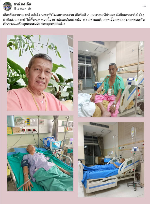 เรียกได้ว่า เป็นนักแสดงในตำนานของคดีเด็ด อย่าง ชาลี ที่ล่าสุดได้ออกมาเผย เกือบเหลือแต่ชื่อ โดยได้เผยว่า เกือบปิดตำนาน ชาลี คดีเด็ด หามเข้าโรงพยาบาลด่วน เมื่อวันที่ 23 เมษายน ที่ผ่านมา ผังผืดเกาะลำไส้ ต้องผ่าตัดด่วน ล้างลำไส้ทั้งหมด ตอนนี้อาการปลอดภัยแล้วครับ ความตายอยู่ใกล้แค่เอื้อม ดูแลสุขภาพด้วยครับ เป็นห่วงและรักทุกคนนะครับ ขอบคุณที่เป็นห่วง