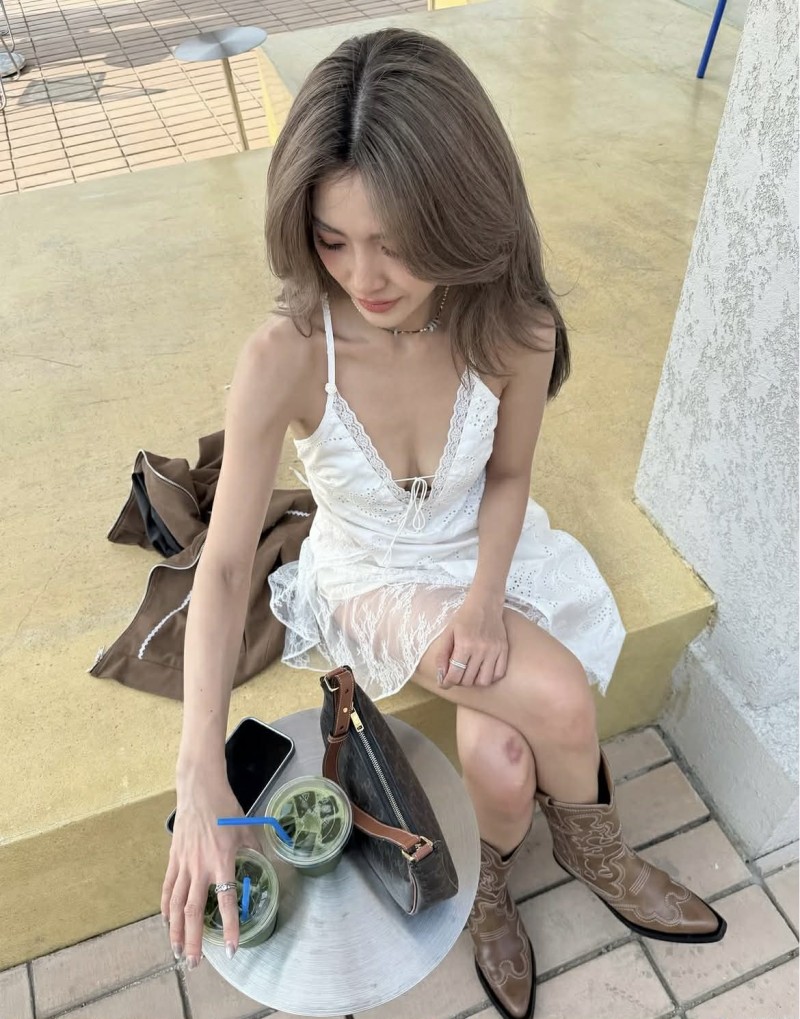 โดย ลุคนี้ เธอ มาในชุดเดรสสายเดี่ยวลูกไม้สีขาว โทนเรียบหรู แต่แฝงความเซ็กซี่แบบพอดี ทำให้ภาพรวมดูทั้งหวาน และมีเสน่ห์