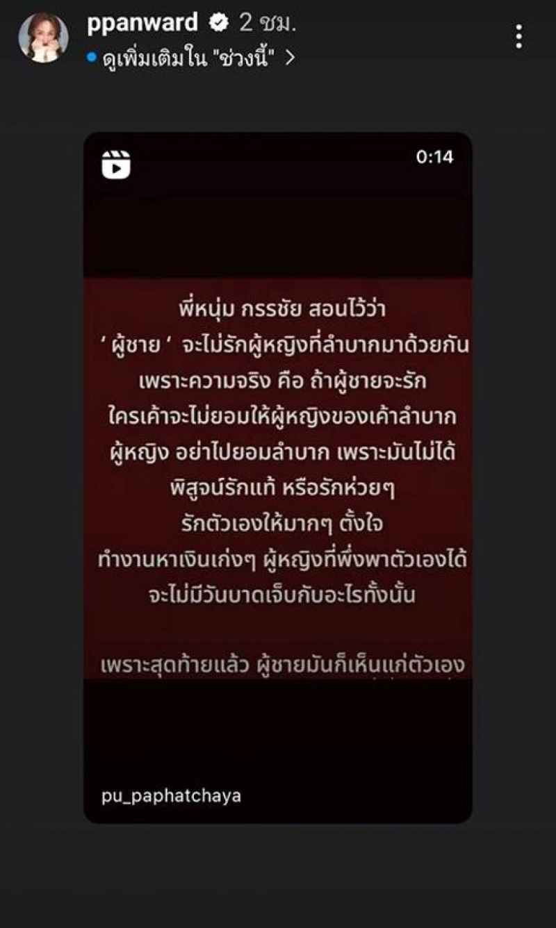 ล่าสุด เป้ย ได้แชร์คำพูดของ หนุ่ม กรรชัย ลงสตอรี่ไอจี โดยมีข้อความระบุว่า พี่หนุ่ม กรรชัย สอนไว้ว่า ผู้ชาย จะไม่รักผู้หญิงที่ลำบากมาด้วยกัน เพราะความจริง คือ ถ้าผู้ชายจะรัก ใครเค้าจะไม่ยอมให้ผู้หญิงของเค้าลำบาก ผู้หญิง อย่าไปยอมลำบาก เพราะมันไม่ได้ พิสูจน์รักแท้ หรือรักห่วยๆ รักตัวเองให้มากๆ ตั้งใจ ทำงานหาเงินเก่งๆ ผู้หญิงที่พึ่งพาตัวเองได้ จะไม่มีวันบาดเจ็บกับอะไรทั้งนั้น เพราะสุดท้ายแล้ว ผู้ชายมันก็เห็นแก่ตัวเอง