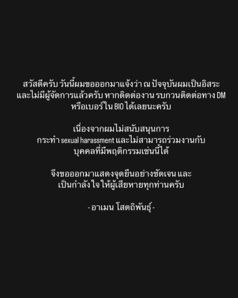 ล่าสุดทางพระเอก อย่าง อาเมน โสตถิพันธุ์ หรือ อาเมน เดอะสตาร์ ก็ได้ออกมาประกาศปลด ผจก. อีคน โดยได้โพสต์ผ่านทางอินสตาแกรมส่วนตัว พร้อมระบุข้อความว่า สวัสดีครับ วันนี้ผมขอออกมาแจ้งว่า ณ ปัจจุบันผมเป็นอิสระ และไม่มีผู้จัดการแล้วครับ หากติดต่องาน รบกวนติดต่อทาง DM หรือเบอร์ใน BIO ได้เลยนะครับ เนื่องจากผมไม่สนับสนุนการกระทำ sexual harassment และไม่สามารถร่วมงานกับบุคคลที่มีพฤติกรรมเช่นนี้ได้ จึงขอออกมาแสดงจุดยืนอย่างชัดเจน และเป็นกำลังใจให้ผู้เสียหายทุกท่านครับ -อาเมน โสตถิพันธุ์