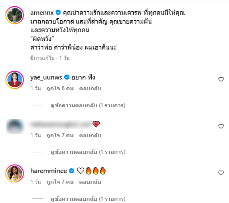 ท่ามกลาง คอมเมนต์จากคนในวงการบันเทิงและแฟนๆ ที่ต่างส่งกำลังใจเป็นจำนวนมาก