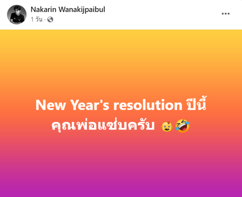 โดยได้โพสต์ตืออีกว่า New Year's resolution ปีนี้ คุณพ่อแซ่บครับ ท่ามกลางเหล่าเพื่อนๆและดาราเข้ามาร่วมยินดีอด้วยจำนวนมาก