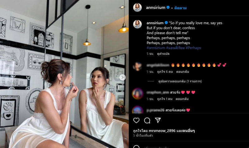 ซึ่งล่าสุดเจ้าตัวได้ปล่อยภาพถ่ายช็อตเด็ดผ่านทางอินสตาแกรมส่วนตัวของเธอ พร้อมเสริฟความร้อนแรงให้แฟนคลับได้ชม เป็นภาพขณะทาลิปสติกหน้ากระจกและไม่ใช่อินเนอร์ที่ร้อนแรงยังมีชุดที่แซ่บและผิวพรรณออร่าของเธอสะท้อนเต็มกระจก ทำเอาแฟนคลับคอมเมนต์สาดหัวใจกันไปรัวๆ