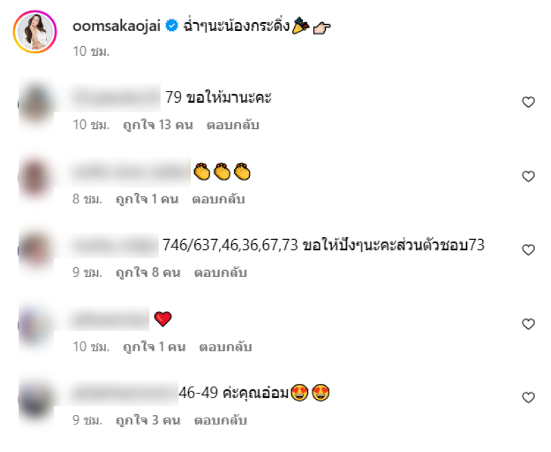 ล่าสุด อ๋อม สกาวใจ ก็ได้กลับมาเปิดเลขให้แฟนคลับได้ติดตามกันเป็นที่เรียบร้อยแล้วกับเลข น้องกระดิ่ง พร้อมกับได้โพสต์ระบุข้อความสั้นๆว่า ฉ่ำๆนะน้องกระดิ่ง โดยเลขที่ปรากฏนั้น คือ 9 3 7 4