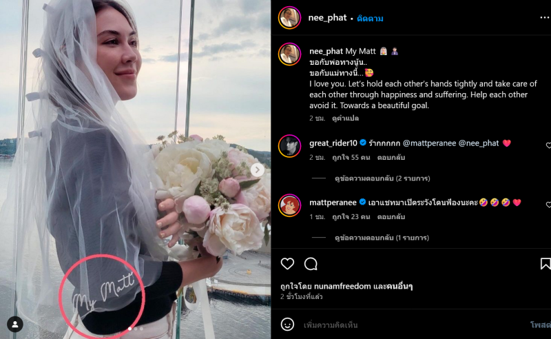 ล่าสุด คุณเเม่ พัชนีย์ คงไทย คุณเเม่ของ เเมท ได้ออกมาโพสต์เเชมที่เฟม(ว่าที่เขย) ส่งมาขออนุญาตเซอร์ไพรส์ เเมท โดยการขอเเต่งงาน โดยโพสต์นี้คุณเเม่พัชนีย์ ได้โพสต์ว่า