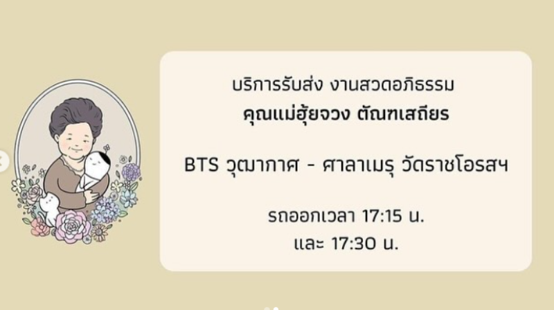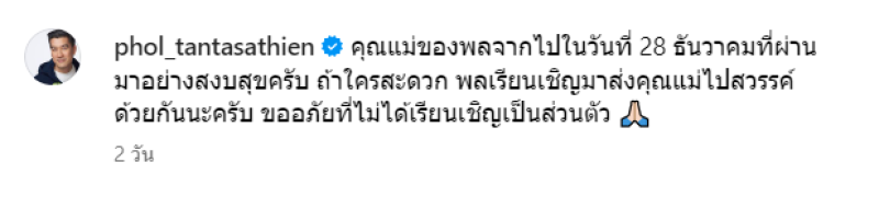 ล่าสุด ทางพล ได้ออกมาอัปเดต พิธีงานศพคุณแม่ โดยได้ระบุข้อความว่า หมายกำหนดการณ์ล่าสุดครับ สำหรับผู้เดินทางโดย bts มีรถมินิบัสรับส่งจากสถานีวุฒากาศ- รถจะออกจาก ปั๊มน้ำมันบางจาก ในเวลา 17:15 น. และ 17:30 น. และออกจากวัดหลังงานพิธี - ที่สถานี BTS ใช้ทางออก 3 จากทางลงสถานี เลี้ยวเข้าถนนวุฒากาศ เดินมาปั๊มบางจาก จะใช้เวลา ~10 นาที