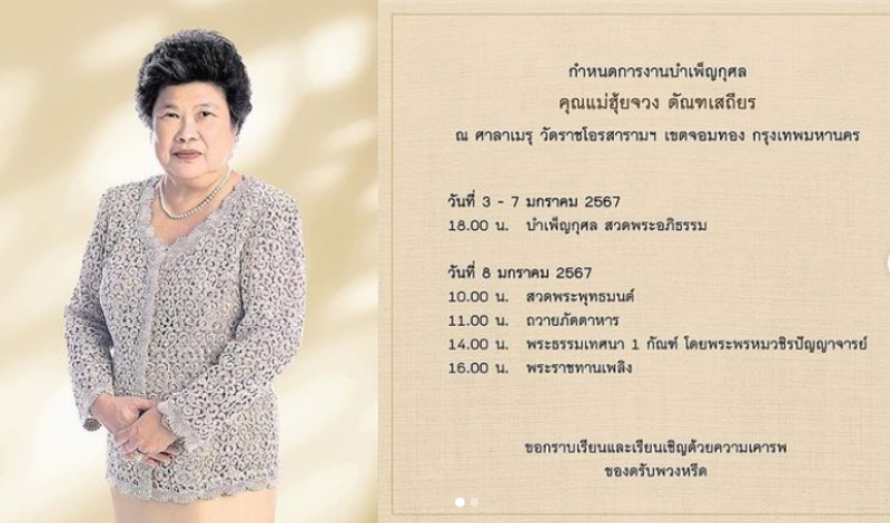 จากกรณีที่ อดีตพระเอกดัง อย่าง พล ตัณฑเสถียร ได้โพสต์ว่าสูญเสียคุณแม่ฮุ้ยจวง ตัณฑเสถียร จากไปอย่างสงบด้วยโรคชรา โดยได้ระบุข้อความว่า คุณแม่ของพลจากไปในวันที่ 28 ธันวาคมที่ผ่านมาอย่างสงบสุขครับ ถ้าใครสะดวก พลเรียนเชิญมาส่งคุณแม่ไปสวรรค์ด้วยกันนะครับ ขออภัยที่ไม่ได้เรียนเชิญเป็นส่วนตัว ท่ามกลางความโศกเศร้าของครอบครัว