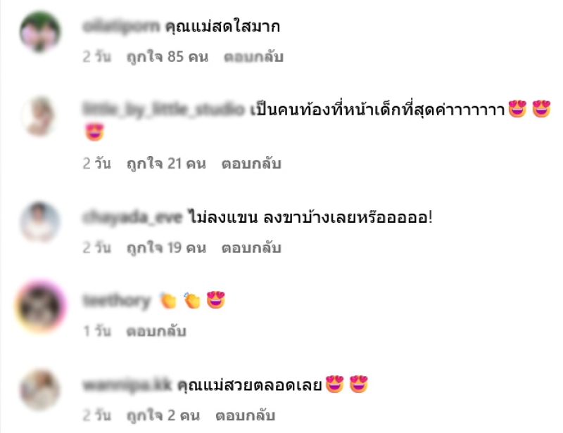 แฟนๆต่างเข้ามาคอมเมนต์ อาทิ คุณแม่สดใสมาก,เป็นคนท้องที่หน้าเด็กที่สุดค่า,ไม่ลงแขน ลงขาบ้างเลยหร๊อ,คุณแม่สวยตลอดเลย เป็นต้น