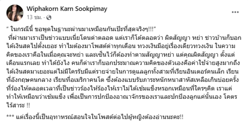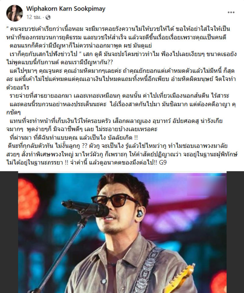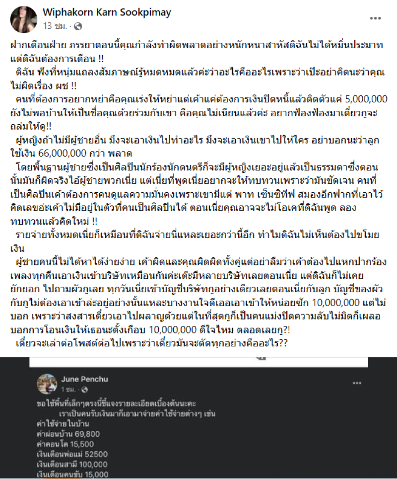 และยังมีโพสต์อีกว่า ฝากเตือนฝ่าย ภรรยาตอนนี้คุณกำลังทำผิดพลาดอย่างหนักหนาสาหัสดิฉันไม่ได้หมิ่นประมาทแต่ดิฉันต้องการเตือน !!