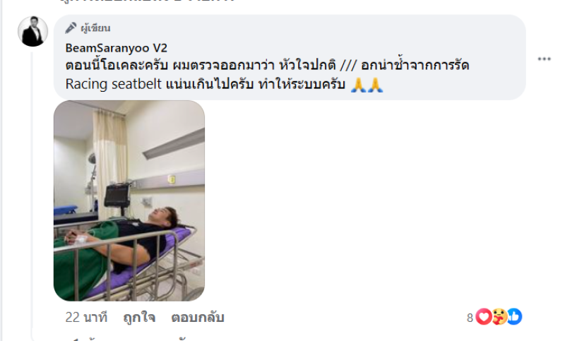 ล่าสุด บีมได้เผยอาการแล้วว่า ตอนนี้โอเคละครับ ผมตรวจออกมาว่า หัวใจปกติ /// อกน่าช้ำจากการรัด Racing seatbelt แน่นเกินไปครับ ทำให้ระบบครับ