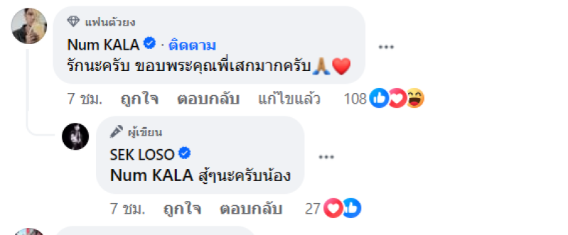 ล่าสุด ทางเพจ SEK LOSO ซึ่งทางเสก โลโซ ได้โพสต์ถึงหนุ่ม กะลา พร้อมระบุแคปชั่นว่า ขอส่งกำลังใจให้น้อง ด้วยรักและห่วงใย และเป็นภาพเสกจับมือกับหนุ่มกะลา นั่นเอง และทางด้านหนุ่มเองก็มาตอบกลับใต้โพสต์ว่า รักนะครับ ขอบพระคุณพี่เสกมากครับ