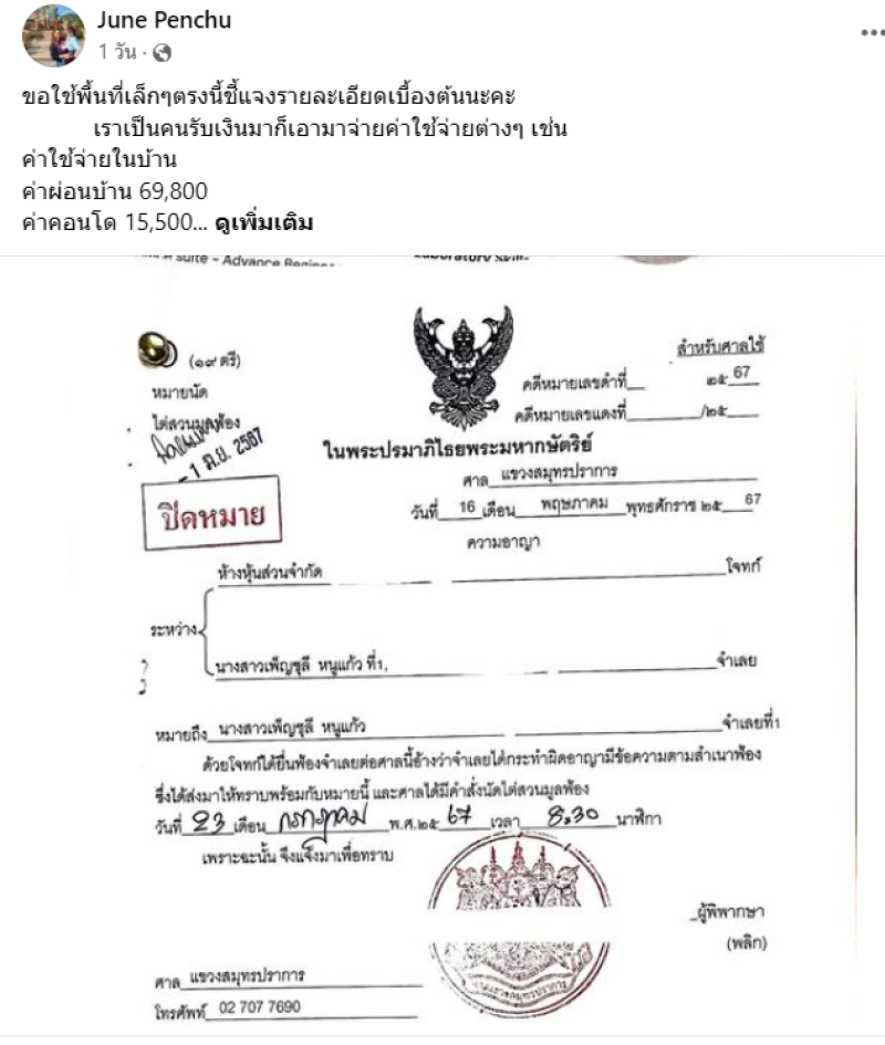 และทางทนาย ยังได้โพสต์อีกว่า ตอนนี้พี่จูนโดนฟ้องคดีอาญา 2 เรื่องนะครับ คือ จากคุณสา..ฟ้อง และจากมือที่สามฟ้อง รับมือศึก 2 ด้านเลย #สงสารยิ่งกว่าสงสาร