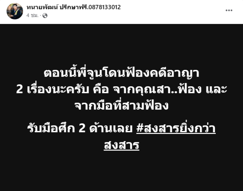 ทุกอย่างจะสู้ได้ร้อยเปอร์เซ็นต์ไหม ในฐานะทนายความก็ไม่ได้ตอบแบบนั้น ในฐานะทนายความที่ทำหน้าที่เราต้องเสนอหลักฐานให้ศาลพิจารณา ว่าน้ำหนักรับฟังได้ฝ่ายไหนยังไง ไม่ได้ดูเฉพาะสเตทเมนต์ ต้องดูหลักฐานอื่นๆ ประกอบหลายส่วนเหมือนกัน ซึ่งเราไม่ทราบเจตนาคู่กรณีว่ามีเจตนาอะไรทำไมถึงใช้กฎหมายนี้ ต้องถามคนที่ฟ้องถึงจะตอบได้ เราไม่สามารถตัดสินใจแทนคนอื่นได้