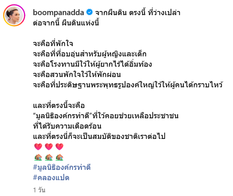 และล่าสุด บุ๋ม ได้ออกมาโพสต์ผ่านอินสตาแกรมส่วนตัว เปิดภาพที่ดินผืนกว้าง ที่เอาไว้ช่วยเหลือประชาชนของมูลนิธิองค์กรทำดี โดยเธอได้ระบุแคปชั่นว่า