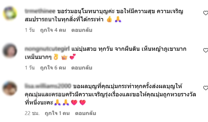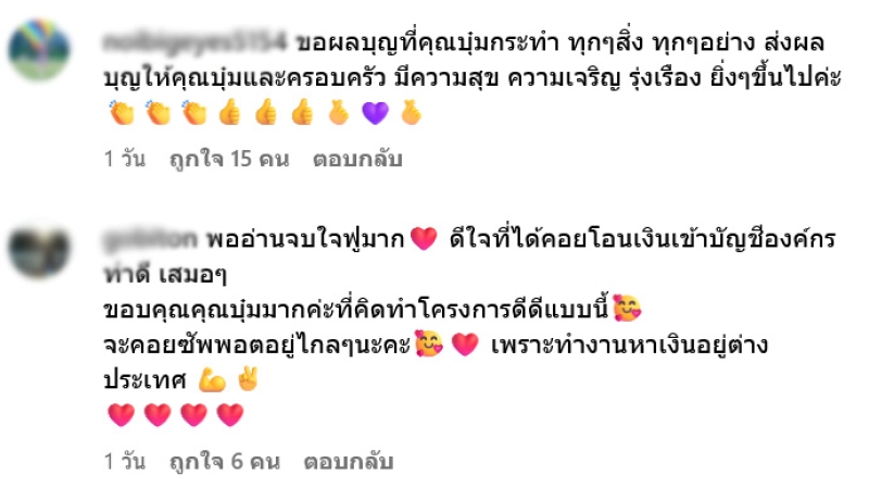 และหลังจากที่เธอได้โพสต์ภาพก็ได้มีแฟนๆต่างมากันคอมเมนต์ อาทิ ขอผลบุญที่คุณบุ๋มกระทำ ทุกๆสิ่ง ทุกๆอย่าง ส่งผลบุญให้คุณบุ๋มและครอบครัว มีความสุข ความเจริญ รุ่งเรือง ยิ่งๆขึ้นไปค่ะ,พออ่านจบใจฟูมาก ดีใจที่ได้คอยโอนเงินเข้าบัญชีองค์กรทำดี เสมอๆ ขอบคุณคุณบุ๋มมากค่ะที่คิดทำโครงการดีดีแบบนี้จะคอยซัพพอตอยู่ไกลๆนะคะ เพราะทำงานหาเงินอยู่ต่างประเทศ ,ขอร่วมอนุโมทนาบุญค่ะ ขอให้มีความสุข ความเจริญ สมปรารถนาในทุกสิ่งที่ได้กระทำ เป็นต้น