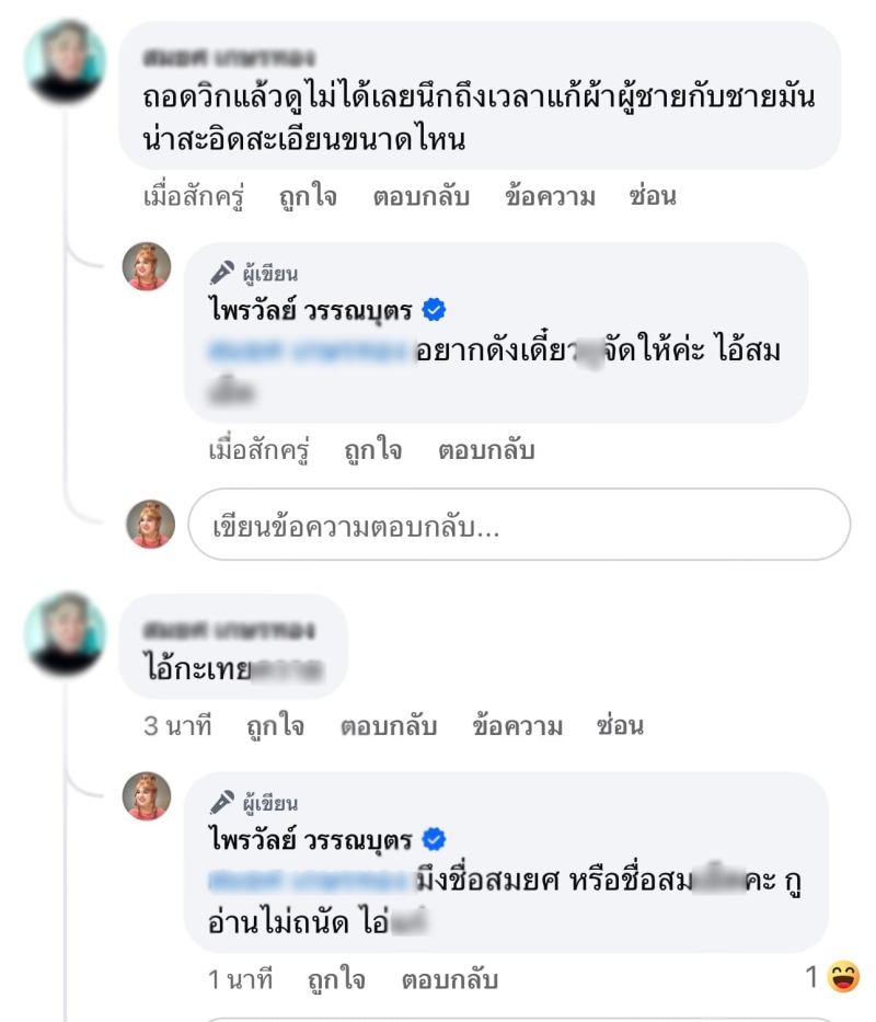 เรียกได้ว่า เป็นนักแสดงที่ฟาดหมดไม่สนลูกใครอย่าง แพรี่ ไพรวัลย์ โดยเฉพาะมนุษย์ลุงที่มาวิพากษ์วิจารณ์เธอไม่หยุด ซึ่งบอกเลยว่าตอนนี้ชีวิต แพรี่ กำลังลงตัวสุดๆแต่ต้องมาเห็นคอมเมนต์ด้านลบและคอมเมนต์ว่าเสียๆหายๆ