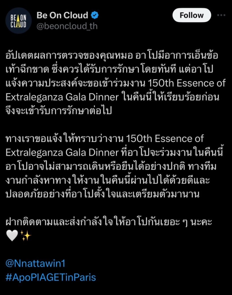 ต่อมาได้ออกมาอัปเดต อีกว่า ผลการตรวจของคุณหมอ อาโปมีอาการเอ็นข้อเท้าฉีกขาด ซึ่งควรได้รับการรักษาโดยทันที แต่อาโปแจ้งความประสงค์จะขอเข้าร่วมงาน 150th Essence of Extraleganza Gala Dinner ในคืนนี้ให้เรียบร้อยก่อนจึงจะเข้ารับการรักษาต่อไป ทางเราขอแจ้งให้ทราบว่างาน 150th Essence of Extraleganza Gala Dinner ที่อาโปจะร่วมงานในคืนนี้ อาโปอาจไม่สามารถเดินหรือยืนได้อย่างปกติ ทางทีมงานกำลังหาทางให้งานในคืนนี้ผ่านไปได้ด้วยดีและปลอดภัยอย่างที่อาโปตั้งใจและเตรียมตัวมานาน
