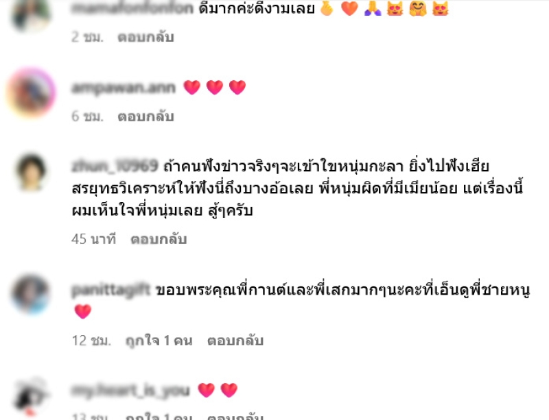 หลังจากที่ กานต์ ได้โพสต์ข้อความลงไป งานนี้ทำเอาแฟนๆต่างเข้ามาคอมเมนต์และส่งหัวใจรัวๆ อาทิ ดีมากค่ะดีงามเลย,ถ้าคนฟังข่าวจริงๆจะเข้าใขหนุ่มกะลา ยิ่งไปฟังเฮียสรยุทธวิเคราะห์ให้ฟังนี่ถึงบางอ้อเลย พี่หนุ่มผิดที่มีเมียน้อย แต่เรื่องนี้ผมเห็นใจพี่หนุ่มเลย สู้ๆครับ,ขอบพระคุณพี่กานต์และพี่เสกมากๆนะคะที่เอ็นดูพี่ชายหนู, เป็นต้น