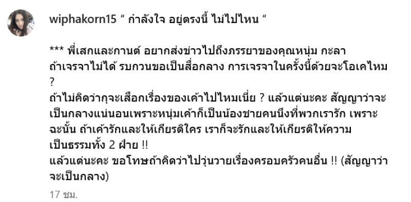 พี่เสกและกานต์ อยากส่งข่าวไปถึงภรรยาของคุณหนุ่ม กะลา ถ้าเจรจาไม่ได้ รบกวนขอเป็นสื่อกลาง การเจรจาในครั้งนี้ด้วยจะโอเคไหม ถ้าไม่คิดว่ากุจะเสือกเรื่องของเค้าไปไหมเนี่ย ? แล้วแต่นะคะ สัญญาว่าจะเป็นกลางแน่นอนเพราะหนุ่มเค้าก็เป็นน้องชายคนนึงที่พวกเรารัก เพราะฉะนั้น ถ้าเค้ารักและให้เกียรติใคร เราก็จะรักและให้เกียรติให้ความเป็นธรรมทั้ง 2 ฝ่าย !! แล้วแต่นะคะ ขอโทษถ้าคิดว่าไปวุ่นวายเรื่องครอบครัวคนอื่น !! (สัญญาว่าจะเป็นกลาง)
