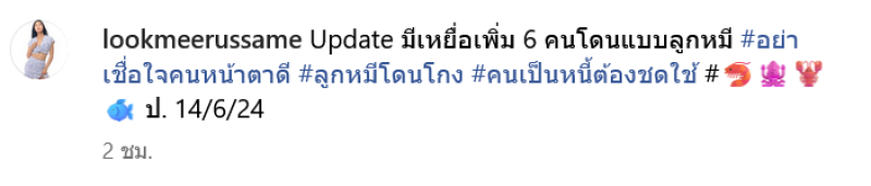 ล่าสุด ลูกหมี ได้อัดคลิปโพสต์ลงอินสตาแกรม พร้อมระบุข้อความว่า Update มีเหยื่อยเพิ่ม6คน โดนแบบ ลูกหมี อย่าเชื่อใจคนหน้าตาดี ลูกหมีโดนโกง คนเป็นหนี้ต้องชดใช้ ป.14/6/24
