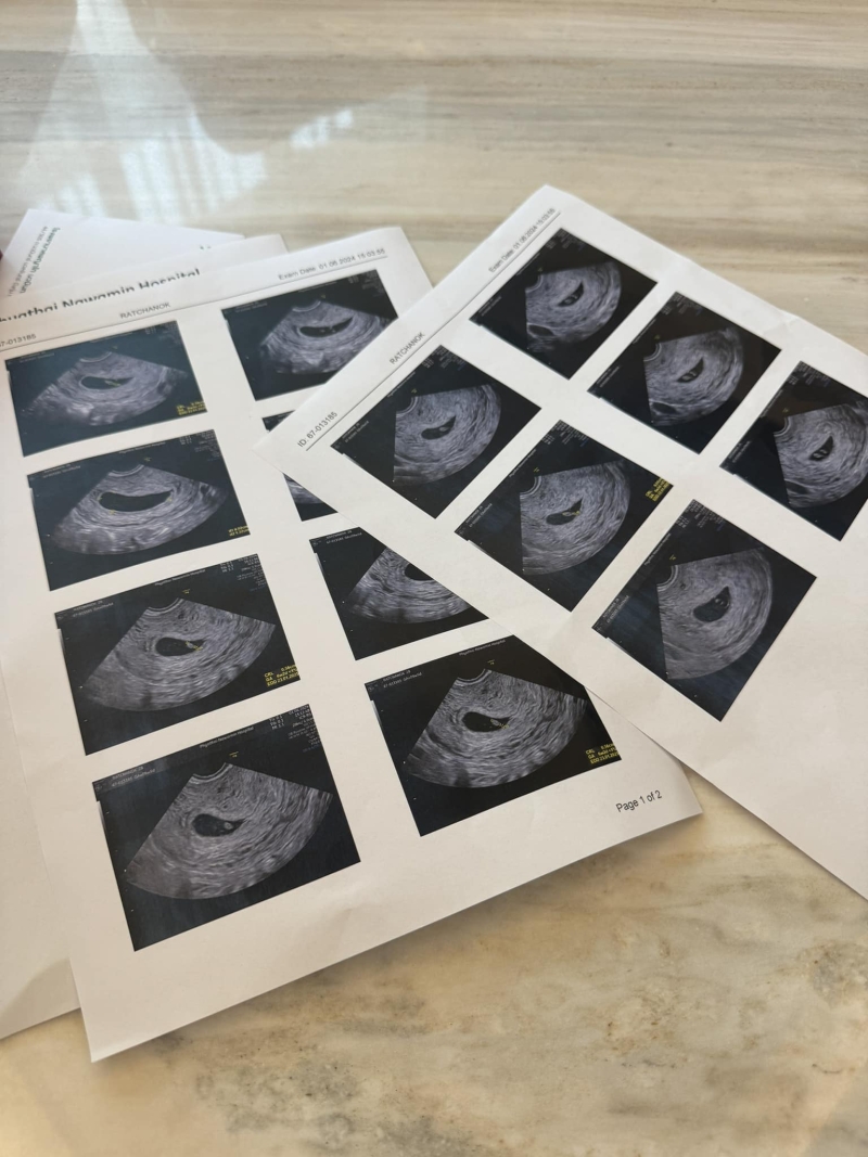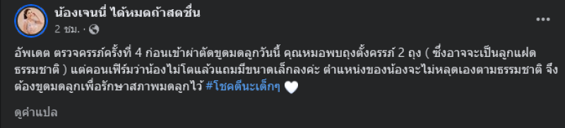 ล่าสุดเธอได้อัพเดตการตั้งครรภ์ครั้งที่4 ก่อนเข้าขูดมดลูกว่า อัพเดต ตรวจครรภ์ครั้งที่ 4 ก่อนเข้าผ่าตัดขูดมดลูกวันนี้ คุณหมอพบถุงตั้งครรภ์ 2 ถุง ( ซึ่งอาจจะเป็นลูกแฝดธรรมชาติ ) แต่คอนเฟิร์มว่าน้องไม่โตแล้วแถมมีขนาดเล็กลงค่ะ ตำแหน่งของน้องจะไม่หลุดเองตามธรรมชาติ จึงต้องขูดมดลูกเพื่อรักษาสภาพมดลูกไว้ โชคดีนะเด็กๆ