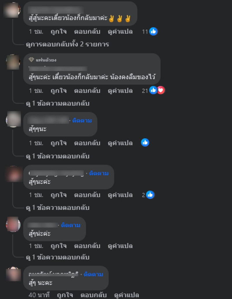 หลังจากที่เธอโพสต์ข้อความไปแฟนๆต่างพากันแห่คอมเมนต์ส่งกำลังใจอย่างล้นหลาม อาทิ สู้สู้นะคะเดี๋ยวน้องก็กลับมาค่ะ,สู้ๆนะค่ะ เดี๋ยวน้องก็กลับมาค่ะ น้องคงลืมของไว้,สุ้ๆๆนะ,สู้ๆนะค่ะ เป็นต้น