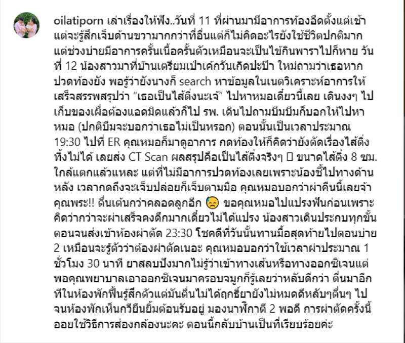 ล่าสุด ออย ได้ออกมาเผนถึงอาการก่อนเป็นไส้ติ่ง โดยได้โพสต์เล่าผ่านทางอินสตาแกรมส่วนตัว oilatiporn โดยได้ระบุข้อความว่า เล่าเรื่องให้ฟัง..วันที่ 11 ที่ผ่านมามีอาการท้องอืดตั้งแต่เช้า แต่จะรู้สึกเจ็บด้านขวามากกว่าที่อื่นแต่ก็ไม่คิดอะไรยังใช้ชีวิตปกติมาก แต่ช่วงบ่ายมีอาการครั้นเนื้อครั้นตัวเหมือนจะเป็นไข้กินพาราไปก็หาย วันที่ 12 น้องสาวมาที่บ้านเตรียมเป่าเค้กวันเกิดปะป๊า ใหม่ถามว่าเธอหากปวดท้องยัง พอรู้ว่ายังนางก็ search หาข้อมูลในเนตวิเคราะห์อาการให้เสร็จสรรพสรุปว่า “เธอเป็นไส้ติ่งนะเจ้” ไปหาหมอเดี๋ยวนี้เลย เดินงงๆ ไปเก็บของเผื่อต้องแอดมิดแล้วก็ไป รพ. เดินไปถามบีมบีมก็บอกให้ไปหาหมอ (ปกติบีมจะบอกว่าเธอไม่เป็นหรอก)
