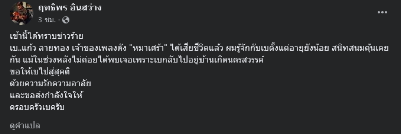 โดยระบุข้อความว่า "เช้านี้ได้ทราบข่าวร้าย เบ..แก้ว ลายทอง เจ้าของเพลงดัง "หมาเศร้า" ได้เสียชีวิตแล้ว ผมรู้จักกับเบตั้งแต่อายุยังน้อย สนิทสนมคุ้นเคยกัน แม้ในช่วงหลังไม่ค่อยได้พบเจอเพราะเบกลับไปอยู่บ้านเกิดนครสวรรค์ ขอให้เบไปสู่สุคติ ด้วยความรักความอาลัย และขอส่งกำลังใจให้ ครอบครัวเบครับ"