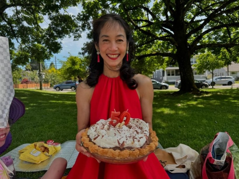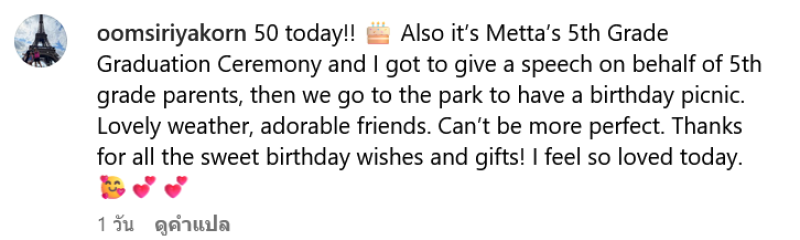 โดยช่วงเช้าไปร่วมพิธีสำเร็จการศึกษาชั้นประถมศึกษาปีที่ 5 ของน้องเมตตา และยังได้ขึ้นไปกล่าวสุนทรพจน์แทนผู้ปกครอง หลังเสร็จสิ้นก็สวนสาธารณะเพื่อปิกนิกเป่าเค้ก พร้อมแคปชั่นว่า 50 today!! Also it's Metta's 5th Grade Graduation Ceremony and I got to give a speech on behalf of 5th grade parents, then we go to the park to have a birthday picnic. Lovely weather, adorable friends. Can't be more perfect. Thanks for all the sweet birthday wishes and gifts! I feel so loved today.