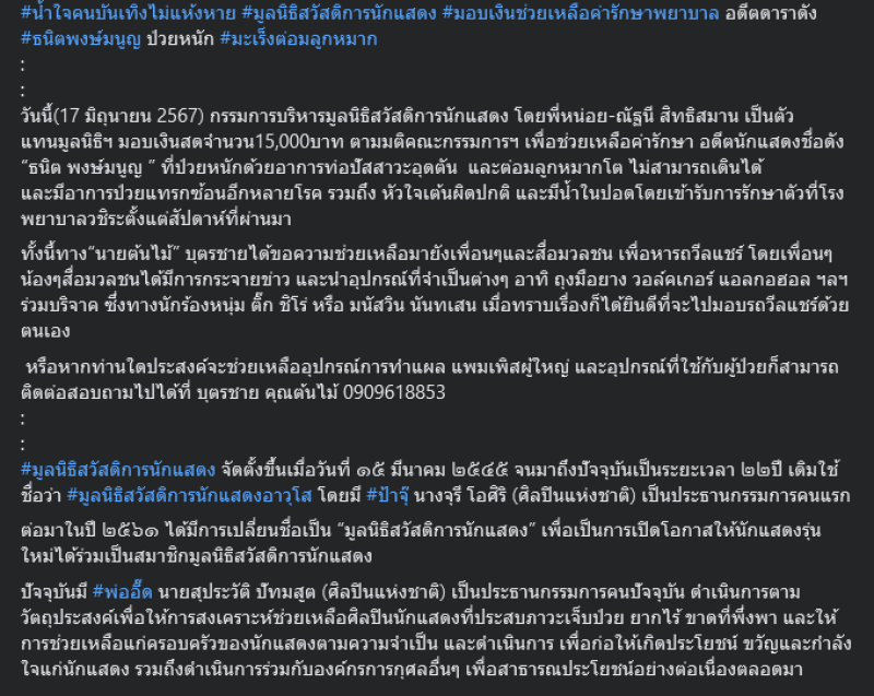 น้ำใจคนบันเทิงไม่แห้งหาย มูลนิธิสวัสดิการนักแสดง มอบเงินช่วยเหลือค่ารักษาพยาบาลอดีตดาราดัง ธนิตพงษ์มนูญ ป่วยหนัก มะเร็งต่อมลูกหมาก วันนี้(17 มิถุนายน 2567) กรรมการบริหารมูลนิธิสวัสดิการนักแสดง โดยพี่หน่อย-ณัฐนี สิทธิสมาน เป็นตัวแทนมูลนิธิฯ มอบเงินสดจำนวน15,000บาท ตามมติคณะกรรมการฯ เพื่อช่วยเหลือค่ารักษา อดีตนักแสดงชื่อดัง ธนิต พงษ์มนูญ ที่ป่วยหนักด้วยอาการท่อปัสสาวะอุดตัน และต่อมลูกหมากโต ไม่สามารถเดินได้ และมีอาการป่วยแทรกซ้อนอีกหลายโรค รวมถึง หัวใจเต้นผิดปกติ และมีน้ำในปอดโดยเข้ารับการรักษาตัวที่โรงพยาบาลวชิระตั้งแต่สัปดาห์ที่ผ่านมา