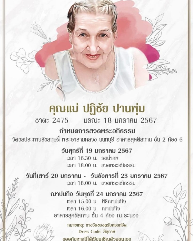 และกำหนดสวดพระอภิธรรม วัดชลประทานรังสฤษดิ์ พระอารามหลวง นนทบุรี อาคารสุคติสถาน ชั้น 2 ห้อง 6 วันที่ 19-23 ม.ค. 67 และญาปนกิจ วันพุธที่ 24 ม.ค. 67 (อาคารสุคติสถาน ชั้น 4 ห้อง ณ ระนอง)