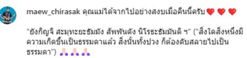 เรียกได้ว่าทำหลายๆคนเข้ามาแสกงความเสียใจกันเป็นจำนวนมาก หลัง แมว จิรศักดิ์วันนี้ (19 ม.ค. 67) โพสต์แจ้งข่าวเศร้า โดยระบุว่าคุณแม่ได้จากไปอย่างสงบเมื่อคืนนี้ครับ "ยังกิญจิ สะมุทะยะธัมมัง สัพพันตัง นิโรธะธัมมันติ ฯ" ("สิ่งใดสิ่งหนึ่งมีความเกิดขึ้นเป็นธรรมดาแล้ว สิ่งนั้นทั้งปวง ก็ต้องดับสลายไปเป็นธรรมดา")