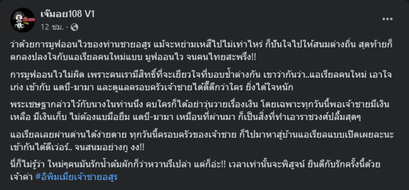 เรียกได้ว่ามีเรื่องทำให้ได้สืบให้เดากันอีกเเล้ว ล่าสุด เจ๊มอย108 V1 ได้เปิดประเด็นชวนคิดกับเรื่องของท่านชายอสูรมูฟออนไว โดยเขียนเล่าว่า ว่าด้วยการมูฟออนไวของท่านชายอสูร แม้จะหย่ามเหสีไปไม่เท่าไหร่ ก็ปันใจไปให้สนมต่างถิ่น สุดท้ายก็ตกลงปลงใจกับแอเรียลคนใหม่แบบ มูฟออนไวจนคนไทยสะพรึง การมูฟออนไวไม่ผิด เพราะคนเรามีสิทธิ์ที่จะเยียวใจที่บอบช้ำต่างกัน เขาว่ากันว่า..แอเรียลคนใหม่ เอาใจเก่ง เข้ากับ แดบี-มามา และดูแลครอบครัวเจ้าชายได้ดี๊ดีกว่าใคร ยิ่งได้ใจหนัก