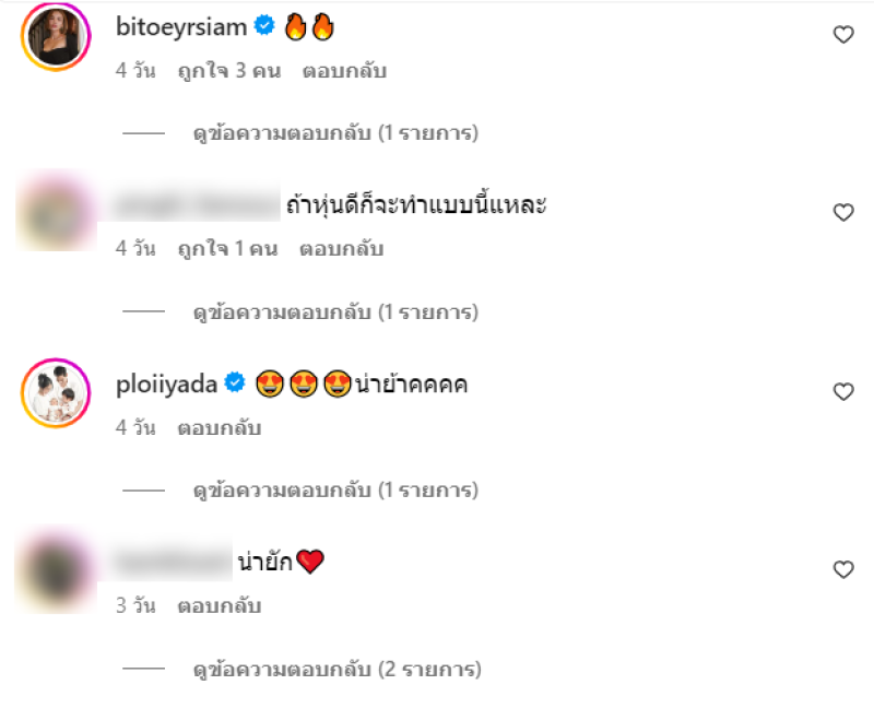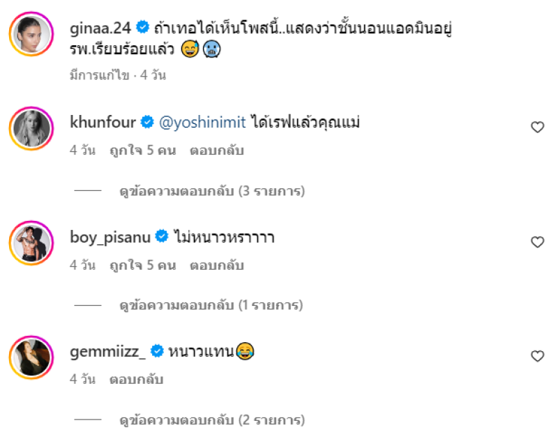 งานนี้ เหล่าคนดังและดาราเข้ามาคอมเมนต์กันจำนวนมาก อาทิ ไม่หนาวหราาาา,ถ้าหุ่นดีก็จะทำแบบนี้แหละ,น้องสาววววหนาวมั้ย,สวยสวยแซ่บค่าาา จะไปโตเกียวเสาร์นี้ได้เจอกันมั้ยน้อ เป็นต้น