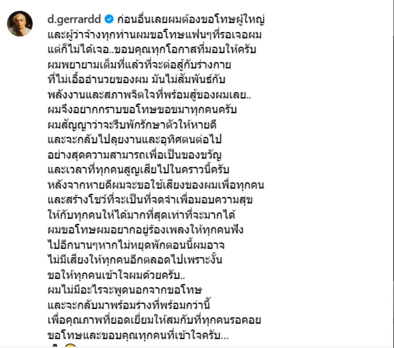 หลังจากหายดีผมจะขอใช้เสียงของผมเพื่อทุกคน และสร้างโชว์ที่จะเป็นที่จดจำเพื่อมอบความสุข ให้กับทุกคนให้ได้มากที่สุดเท่าที่จะมากได้ ผมขอโทษผมอยากอยู่ร้องเพลงให้ทุกคนฟัง ไปอีกนานๆหากไม่หยุดพักตอนนี้ผมอาจ ไม่มีเสียงให้ทุกคนอีกตลอดไปเพราะงั้น ขอให้ทุกคนเข้าใจผมด้วยครับ.. ผมไม่มีอะไรจะพูดนอกจากขอโทษ และจะกลับมาพร้อมร่างที่พร้อมกว่านีั เพื่อคุณภาพที่ยอดเยี่ยมให้สมกับที่ทุกคนรอคอย ขอโทษและขอบคุณทุกคนที่เข้าใจครับ…
