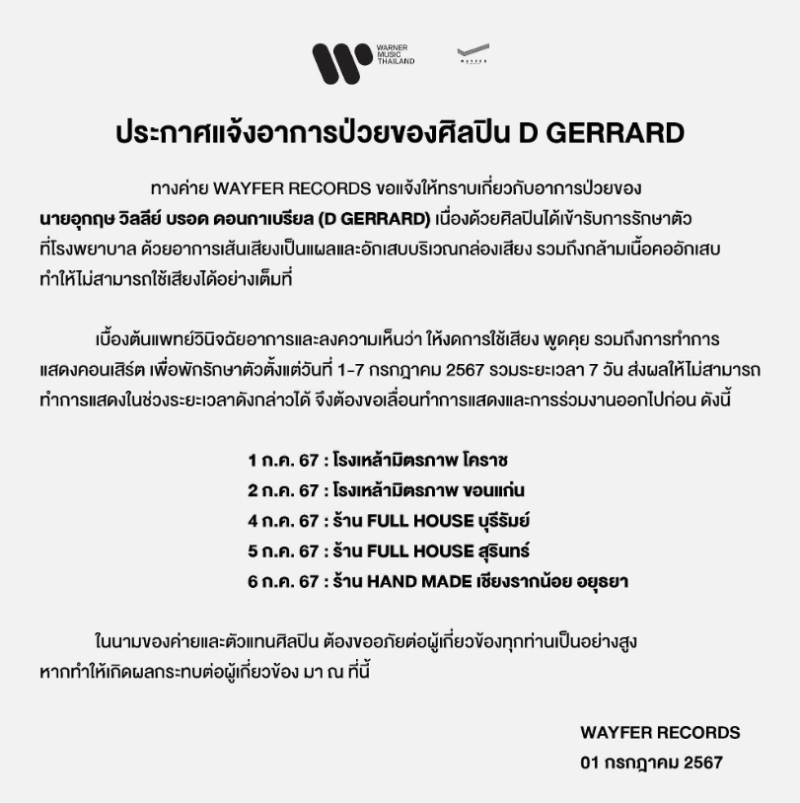 เรียกได้ว่า เป้นอีกหนึ่งนักร้องและนักแสดง อย่าง บิ๊ก D Gerrard หรือ ไบรอัน เจอร์ราร์ด อุกฤษ วิลลีย์ บรอด ดอนกาเบียล ที่มีงานเยอะมาก เดินสายแทบไม่ได้พัก ล่าสุดทางค่ายได้ออกมาประกาศ แจ้งอาการป่วยของบิ๊กว่า พบอาการเส้นเสียงเป็นแผลและอักเสบบริเวณกล่องเสียง รวมถึงกล้ามเนื้อคออักเสบ ทำให้ไม่สามารถใช้เสียงได้อย่างเต็มที่ หมอสั่งงดใช้เสียง พูดคุย รวมถึงการแสดงคอนเสิร์ต เพื่อรักษาตัว 7 วัน เริ่ม วันที่ 1-7 ก.ค. ทุกการแสดงจำเป็นต้องเลื่อนออกไปก่อน