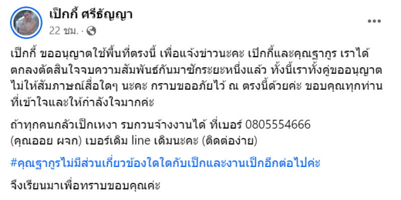 จากกรณีที่ เป็กกี้ ศรีธัญญา นักแสดงพิธีกรดัง ได้ออกมาโพสต์ข้อความลงบนเฟซบุ๊กส่วนตัวระบุว่า เป็กกี้ ขออนุญาตใช้พื้นที่ตรงนี้ เพื่อแจ้งข่าวนะคะ เป๊กกี้และคุณฐากูร เราได้ตกลงตัดสินใจจบความสัมพันธ์กันมาซักระยะหนึ่งแล้ว ทั้งนี้เราทั้งคู่ขออนุญาตไม่ให้สัมภาษณ์สื่อใดๆ นะคะ กราบขออภัยไว้ ณ ตรงนี้ด้วยค่ะ ขอบคุณทุกท่านที่เข้าใจและให้กำลังใจมากค่ะ