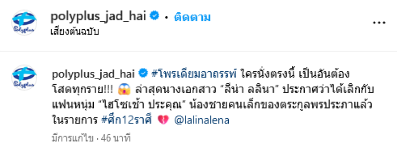 ซึ่งทางด้านอินสตาแกรม polyplus_jad_hai ได้โพสต์ข้อความไว้ว่า โพรเดียมอาถรรพ์ ใครนั่งตรงนี้ เป็นอันต้องโสดทุกราย ล่าสุดนางเอกสาว "ลีน่า ลลินา" ประกาศว่าได้เลิกกับแฟนหนุ่ม "ไฮโซเช้า ประคุณ" น้องชายคนเล็กของตระกูลพรประภา แล้วในรายการ ศึก12ราศี lalinalena..