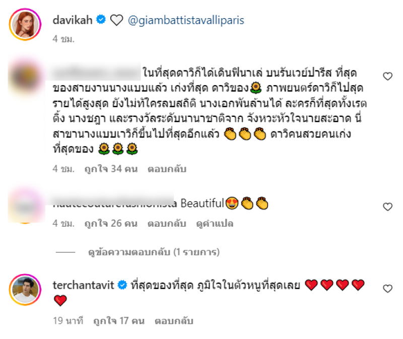 ท่ามกลาง ความยินดีของเพื่อนๆวงการ และด้านหวานใจ อย่าง เต๋อ ฉันทวิชช์ ก็ได้เข้ามาแสดงความยินด้วยว่า ที่สุดของที่สุด ภูมิใจในตัวหนูที่สุดเลย นั่นเอง