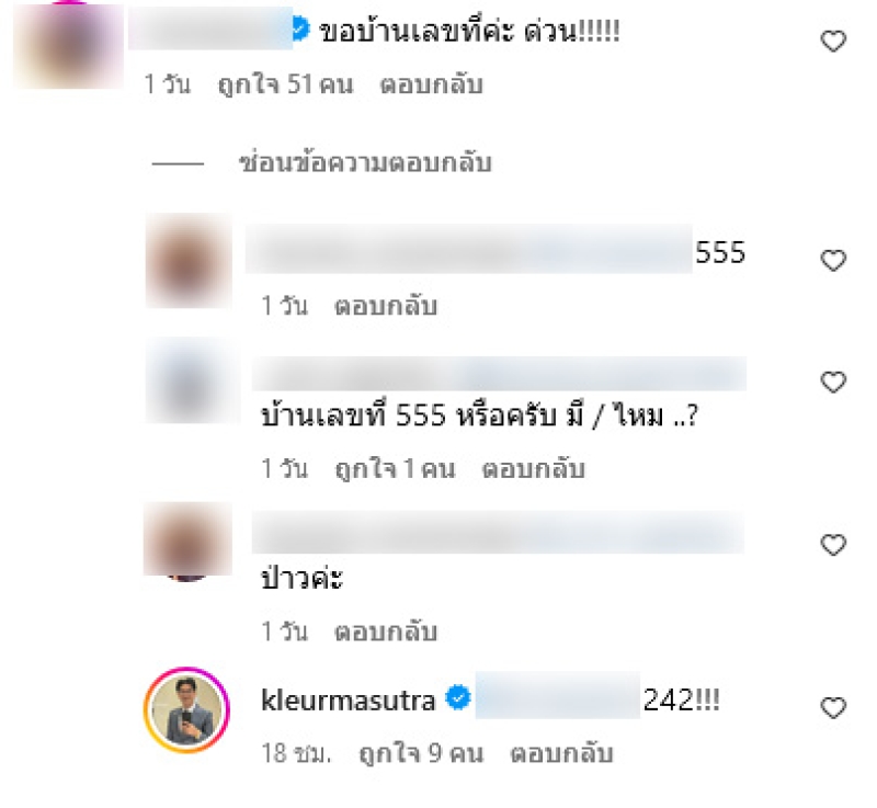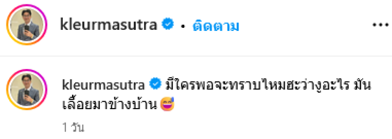 ทางด้าน เกลือ ได้โพสต์ข้อความในอินสตาแกรมส่วนตัวว่า มีใครพอจะทราบไหมฮะว่างูอะไร มันเลื้อยมาข้างบ้าน แฟนๆต่างเข้ามาคอมเมนต์กันอย่างมาก อาทิ งูสิงหางลายค่ะ น้องไม่มีพิษค่ะ ติด พรบ. คุ้มครองสัตว์ค่ะ,เป็นห่วงนะครับ แต่ขอเลขบ้านด้วยครับ5555 เรามันมาทางนี้ ทั้งยังได้ถามถึงบ้านเลขที่อีกด้วย ทางด้าน เกลือ ก็ได้ตอบกลับคอมเมนต์ว่า 242