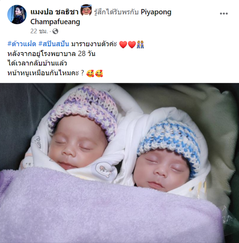 โดยโพสต์ก่อนหน้า แมงปอได้เผยอาการลูกแฝดว่า อยากให้ทุกคนเห็นความน่ารักของ #ต้าวแฝด จังเลย อิแม่เห่อลูกอ่ะนะ จริงๆจะได้ออกจากโรงพยาบาลเมื่อวันศุกร์ที่ผ่านมาแล้วค่ะ แต่แฝดมีพังผืดใต้ลิ้น ทั้งคู่ เลยปรึกษาคุณหมอ...ขอตัดพังผืดให้จบๆ และรอตรวจตาไปทีเดียวเลยค่ะ #วันอังคาร นี้ #ต้าวแฝด จะมาโชว์ตัวน๊า #สปินสปัน