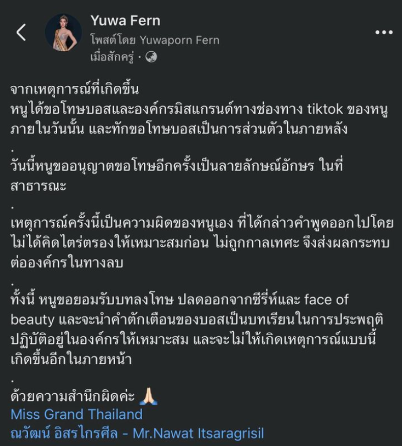 ล่าสุด ทางยุวเฟิร์น ได้ออกมาโพสต์ขอโทษแล้ว พร้อมระบุข้อความว่า จากเหตุการณ์ที่เกิดขึ้น หนูได้ขอโทษบอสและองค์กรมิสแกรนด์ทางช่องทาง tiktok ของหนูภายในวันนั้น และทักขอโทษบอสเป็นการส่วนตัวในภายหลัง