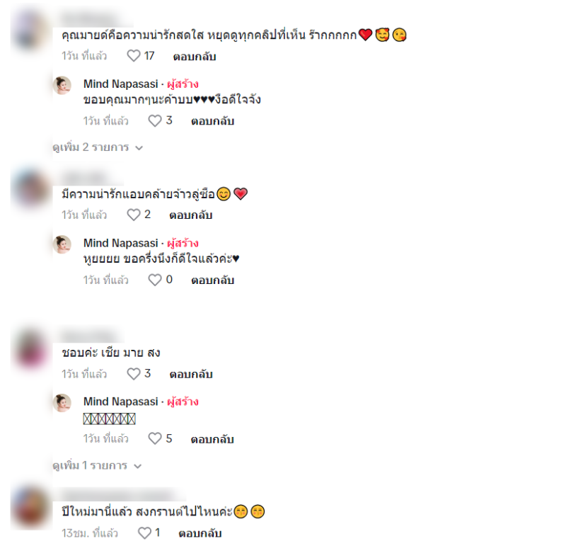 ล่าสุด ในช่อง Tiktok @mind_napasasi ของสาวมายด์ ได้ลงคลิปคลิปตัวเอง พร้อมระบุข้อความว่า เซอร์ไพรส์จากแฟน ดินเนอร์มื้อแรกฉลองปีใหม่...ไปค่ะ! #ปีใหม่2024 #มายด์ณภศศิ #tiktokคนบันเทิง #happynewyear2024 #CapCut ซึ่งเป็นคลิปที่กำลังเดินเข้าร้านอาหารแห่งหนึ่งมี่เขาใหญ่นั่นเอง