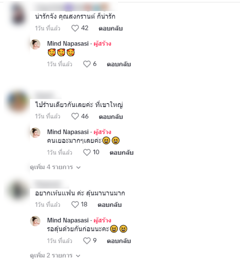 งานนี้ เหล่าชาวเน็ตเข้ามาคอมเมนต์กันสนั่น อาทิ น่ารักจัง คุณสงกรานต์ ก็น่ารัก,ไปร้านเดียวกันเลยค่ะ ที่เขาใหญ่,อยากเห้นเเฟน ค่ะ ลุ้นมานานมาก,รีวิวคนตรงหน้าหน่อยค้าาา,น่ารักมากๆๆคะ อยากเห็นหน้าแฟนจัง เป็นต้น อุ๊ย แบบนร้ต้องมาลุ้นแล้วว่า แฟนของสาวมายด์-ณภศศิ นั้น ใช่หนุ่ม สงกรานต์ เตชะณรงค์ หรือเปล่านะ