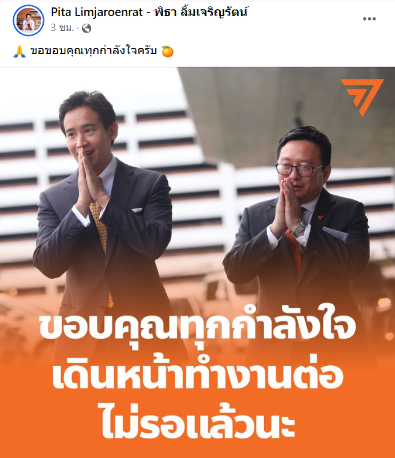 ล่าสุดทาง facebook Pita Limjaroenrat - พิธา ลิ้มเจริญรัตน์ ได้ออกมาโพสต์ว่า ขอบคุณทุกกำลังใจ เดินหน้าทำงานต่อ ไม่รอแล้วนะ พร้อมระบุแคปชั่นเพิ่มเติมบอกว่า ขอขอบคุณทุกกำลังใจครับ